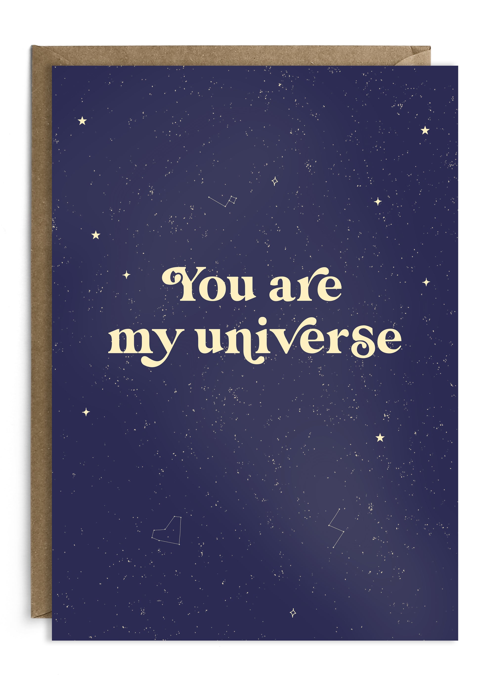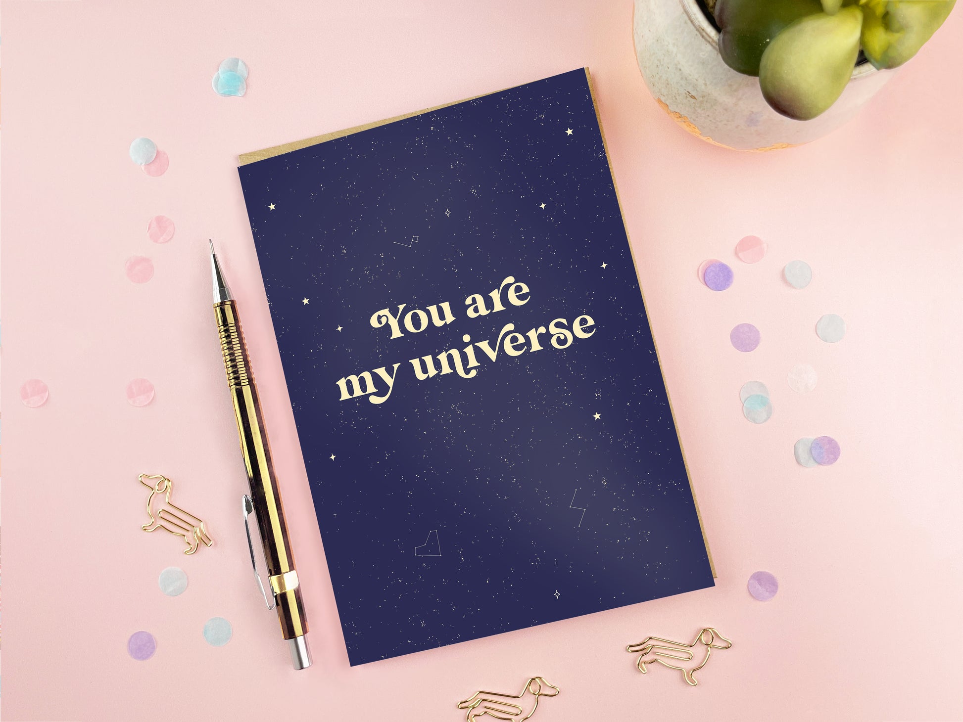 This cosmic love card is part of a collection of out of this world greeting cards using the infinite expanse of the universe as a background. Other cosmic greeting cards include a housewarming card, new baby card, love card and anniversary card designs.