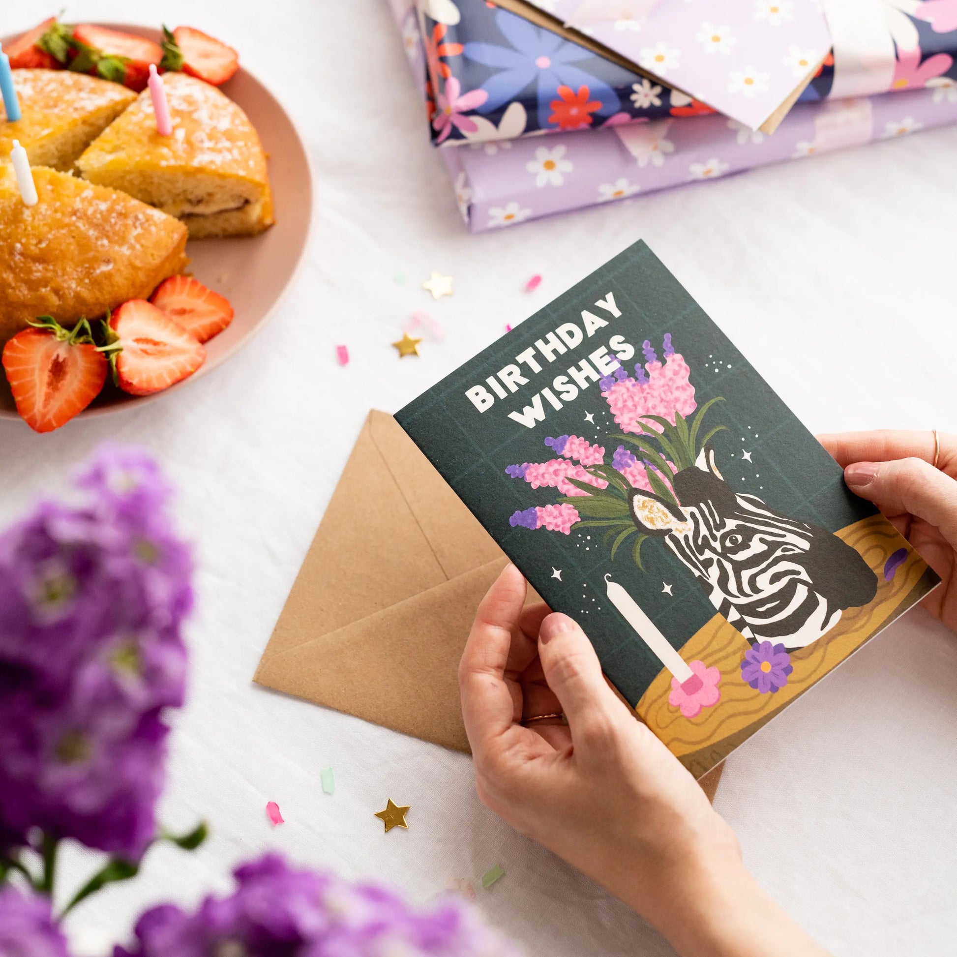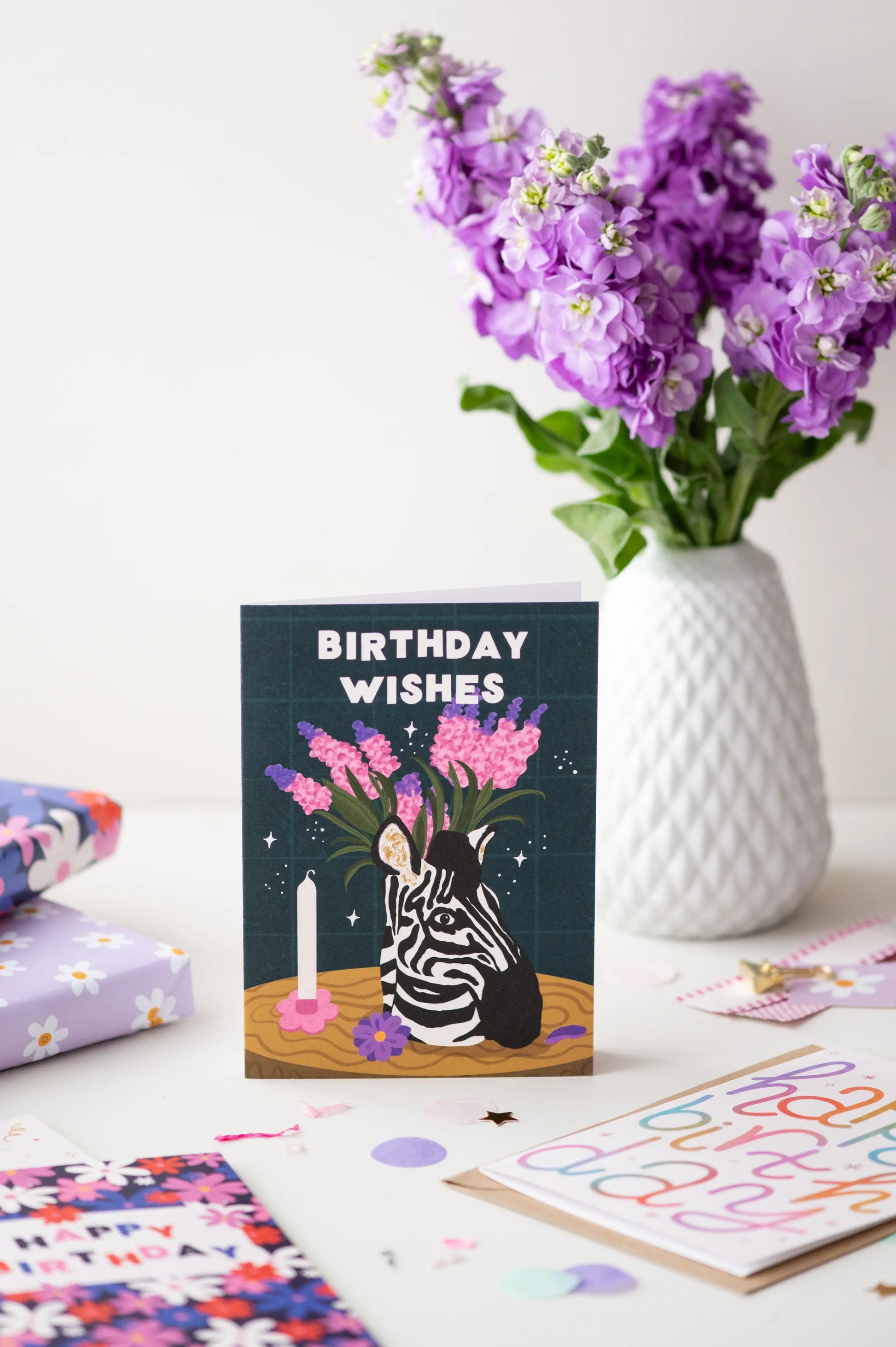 This still lifestyle birthday card features a highly-detailed illustrated zebra head-shaped vase filled with pink flowers, surrounded by candles on a wooden table against a dark green background. The white block-letter caption on the birthday card reads “Birthday Wishes” while the stoic zebra stares on.