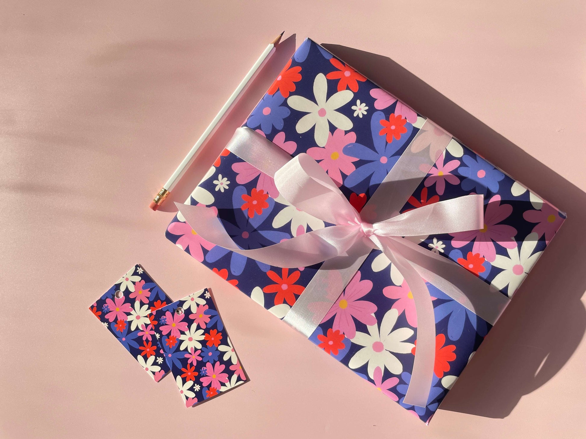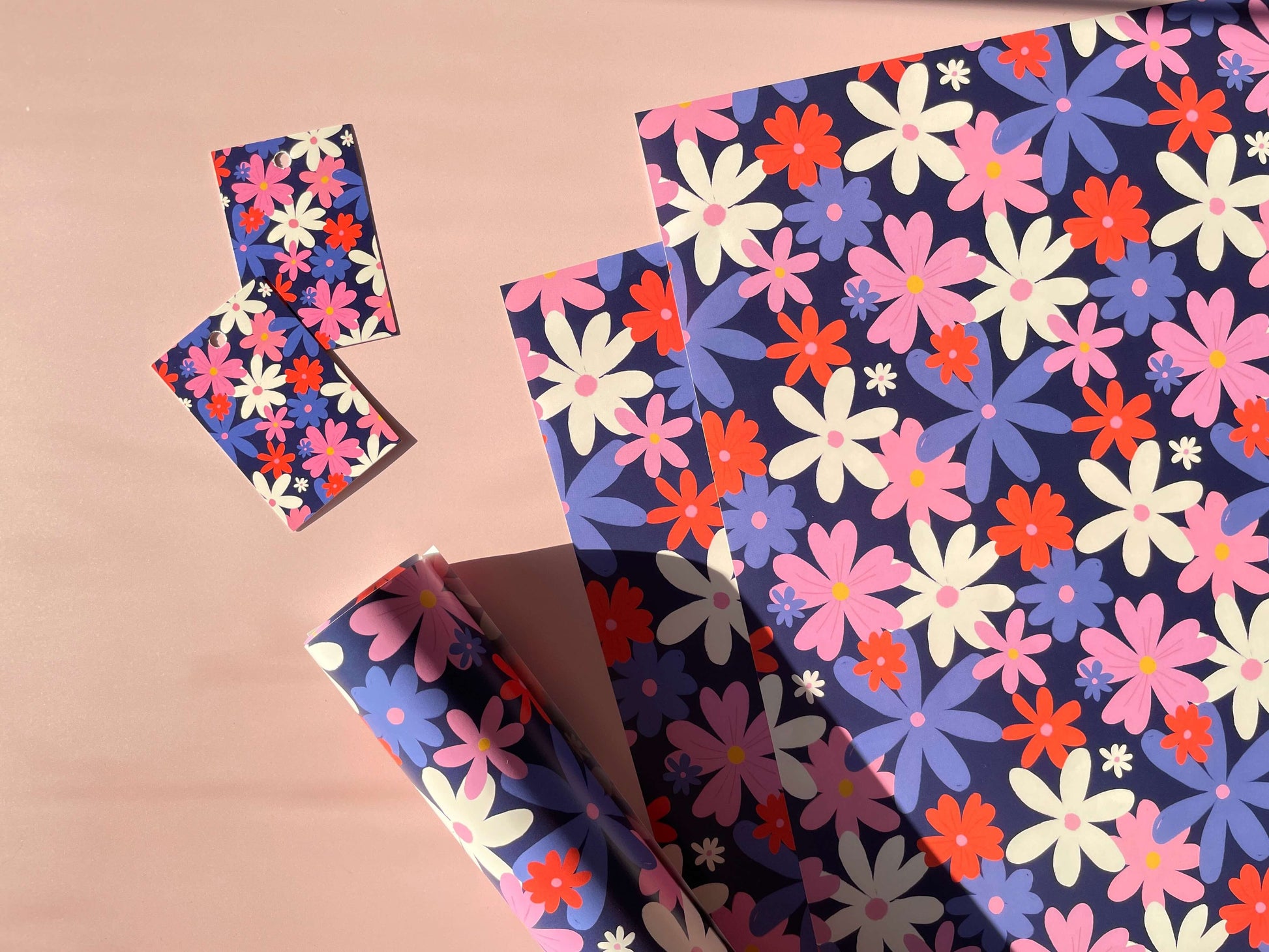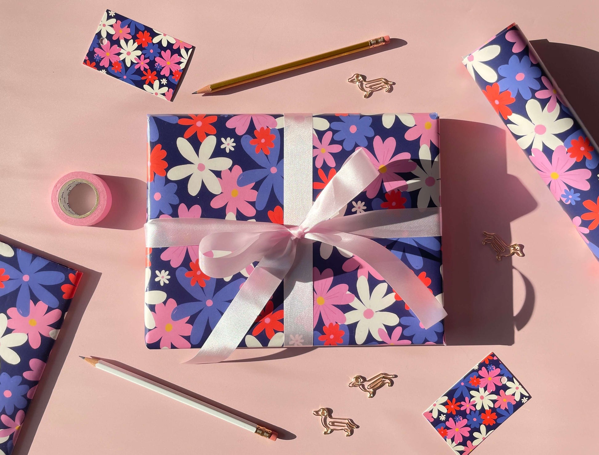 Dozens of dainty daisies decorate the dark blue background of this patterned floral wrapping paper. The flower petals on the gift wrap sheets are painted in a colour palette of pink, white, blue, and red, creating an all-occasion gift wrap design.