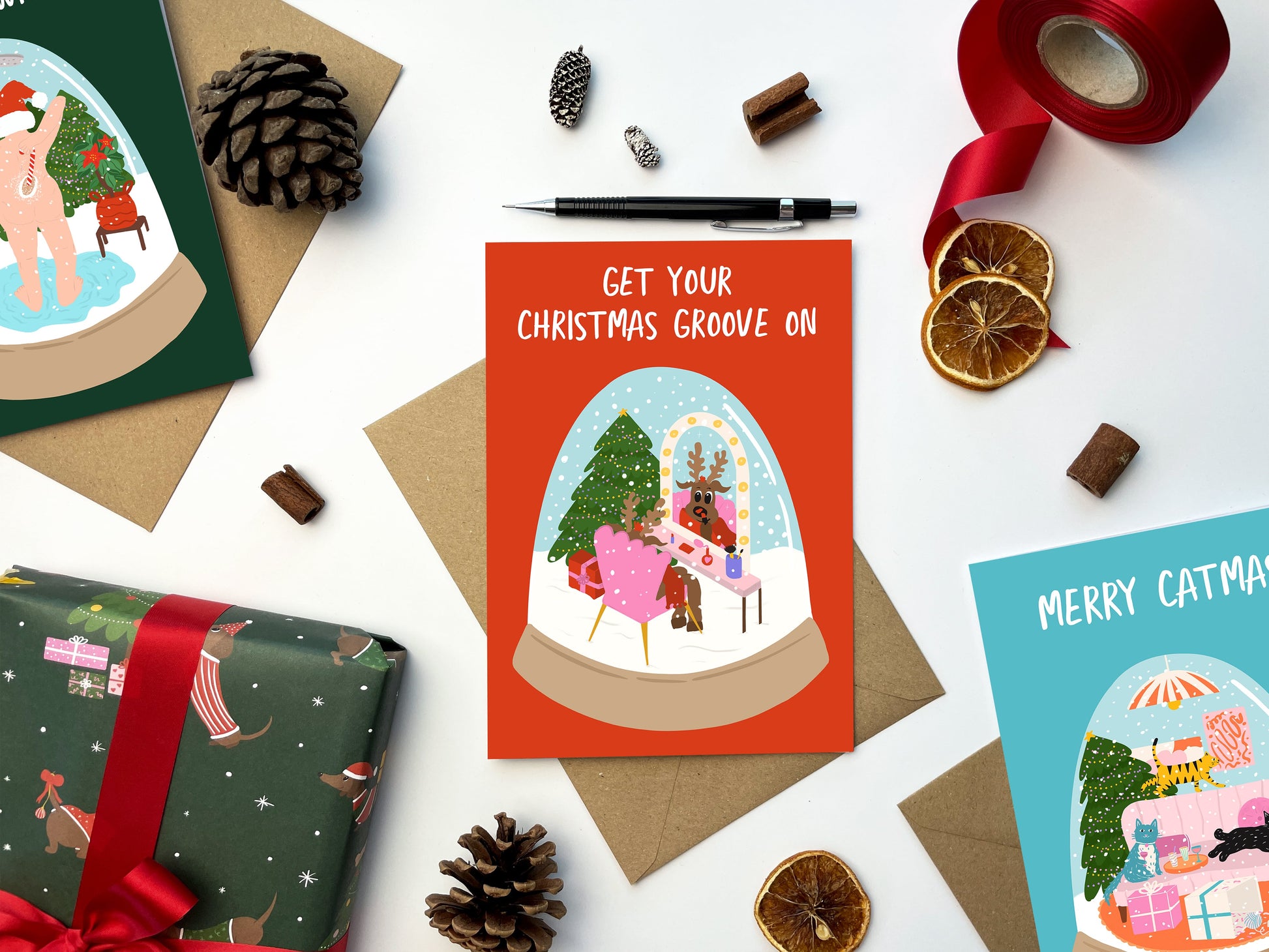 Above the snowglobe is the Christmas card’s white caption, standing out boldly against the red background to read “Get Your Christmas Groove On”. This holiday card is part of a Christmas card collection from Tikkled Pink, each showing a unique wintery scene encased in a snowglobe.