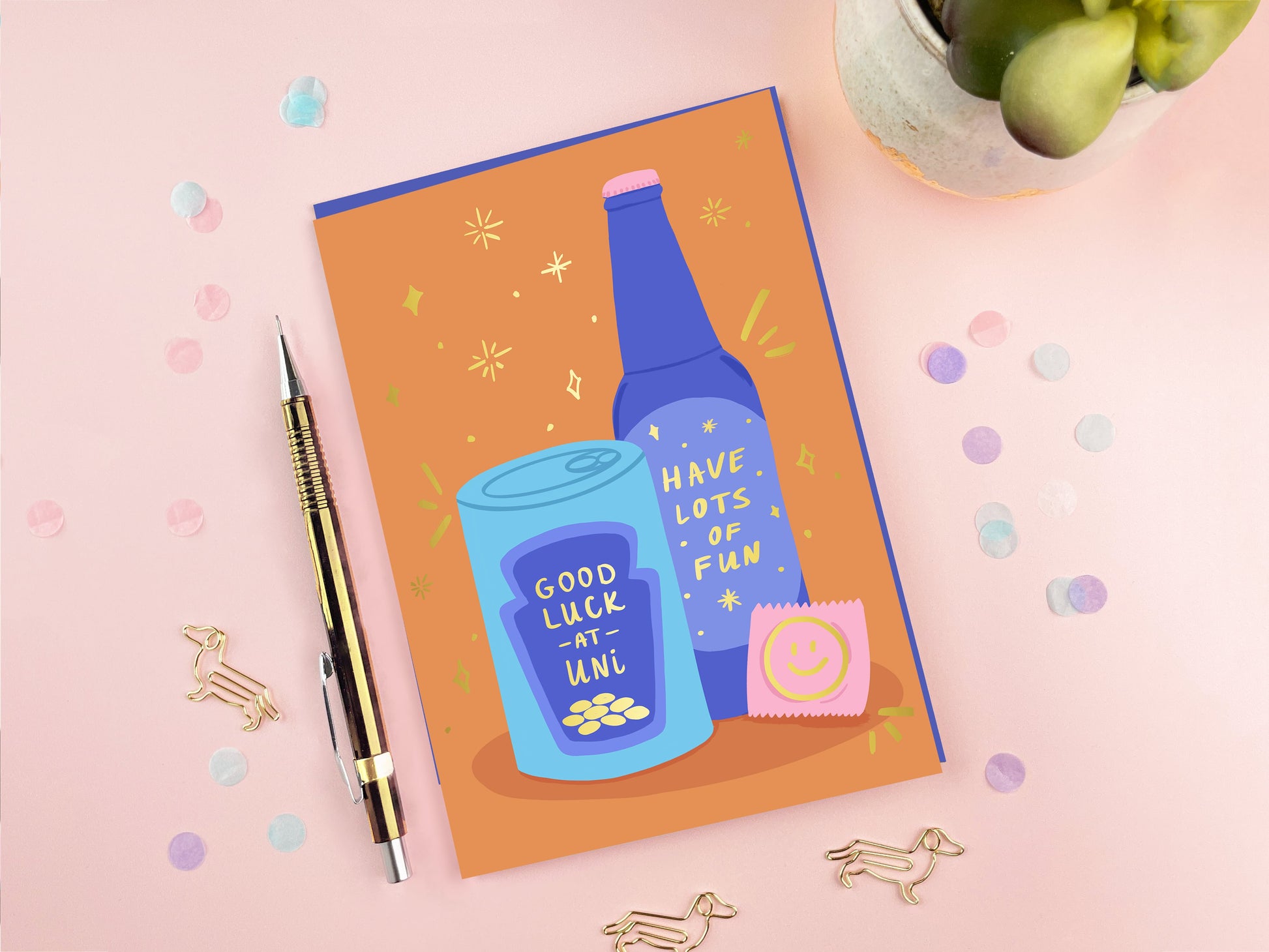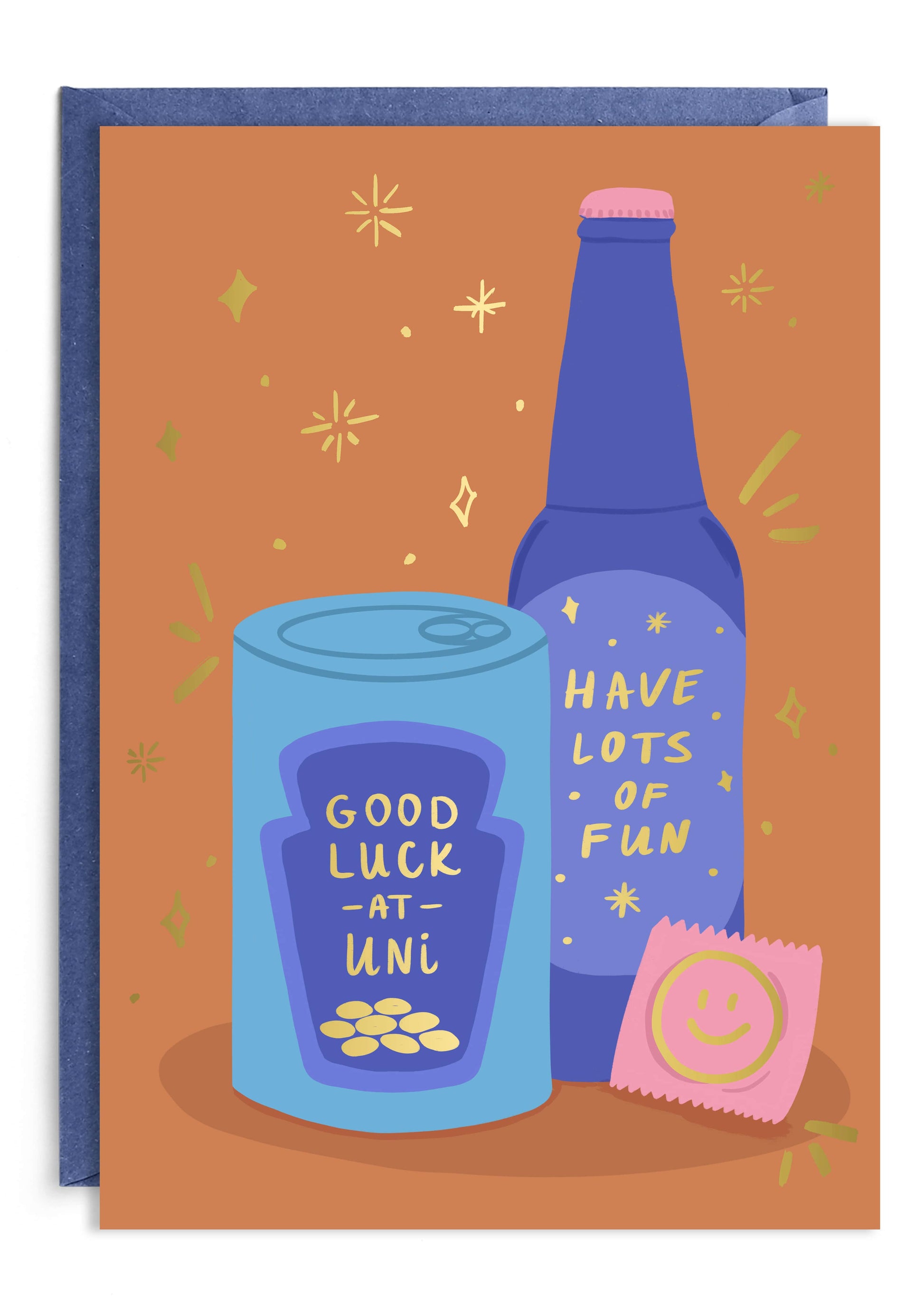 Gold foil details glisten on the brown background of this card, outlining the captions which read “Good Luck at Uni” and “Have Lots of Fun” as part of the labels on the beans and beer, and a cheeky golden smiley face grins from the condom’s wrapper. Add a handwritten message to the inside of the good luck card and send this student off with a smile.