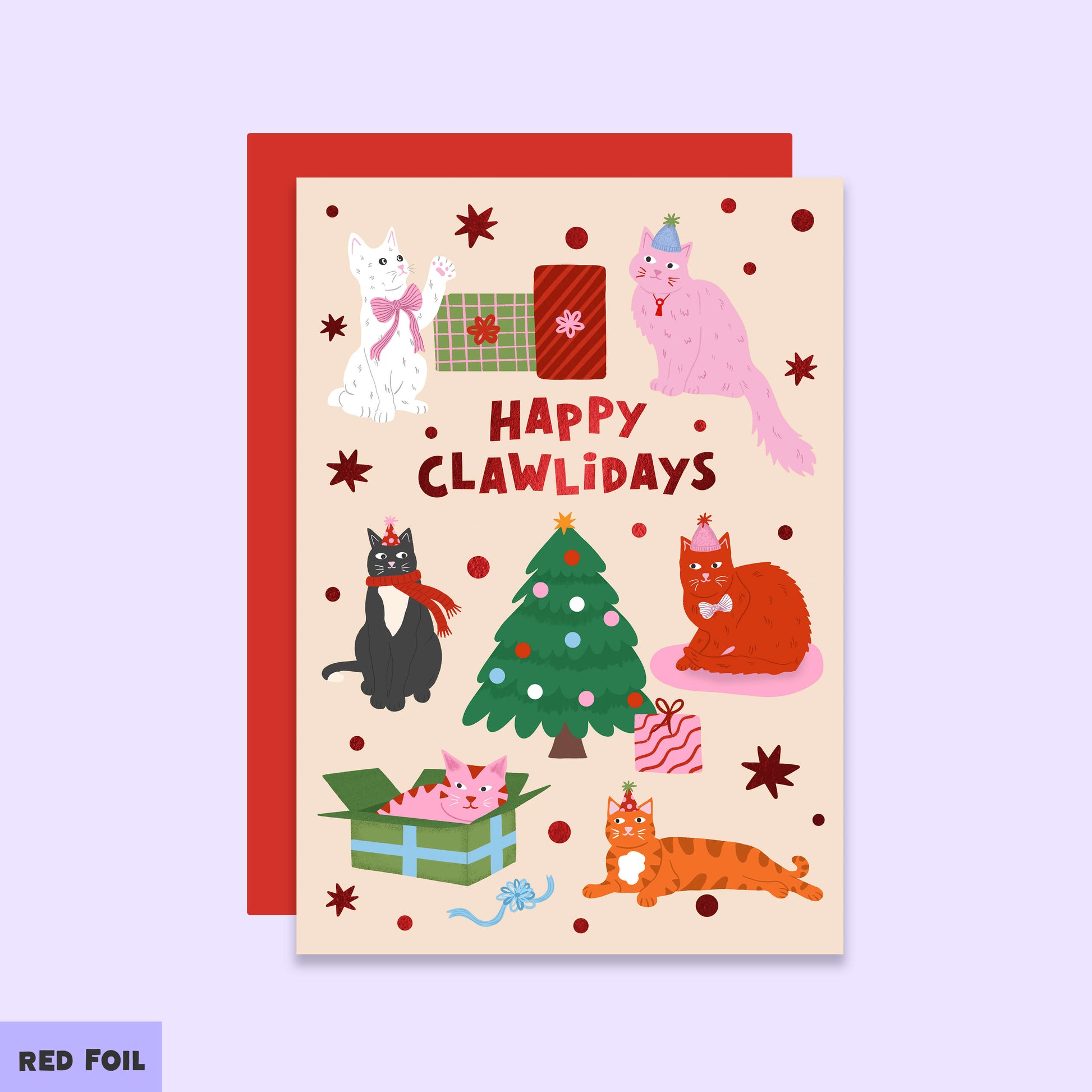 The playful message "Happy Clawlidays" is finished with luxurious red foil, adding a touch of elegance to this charming design. Printed on premium card stock with a smooth, matte finish, it's a delightful keepsake that cat lovers will treasure.