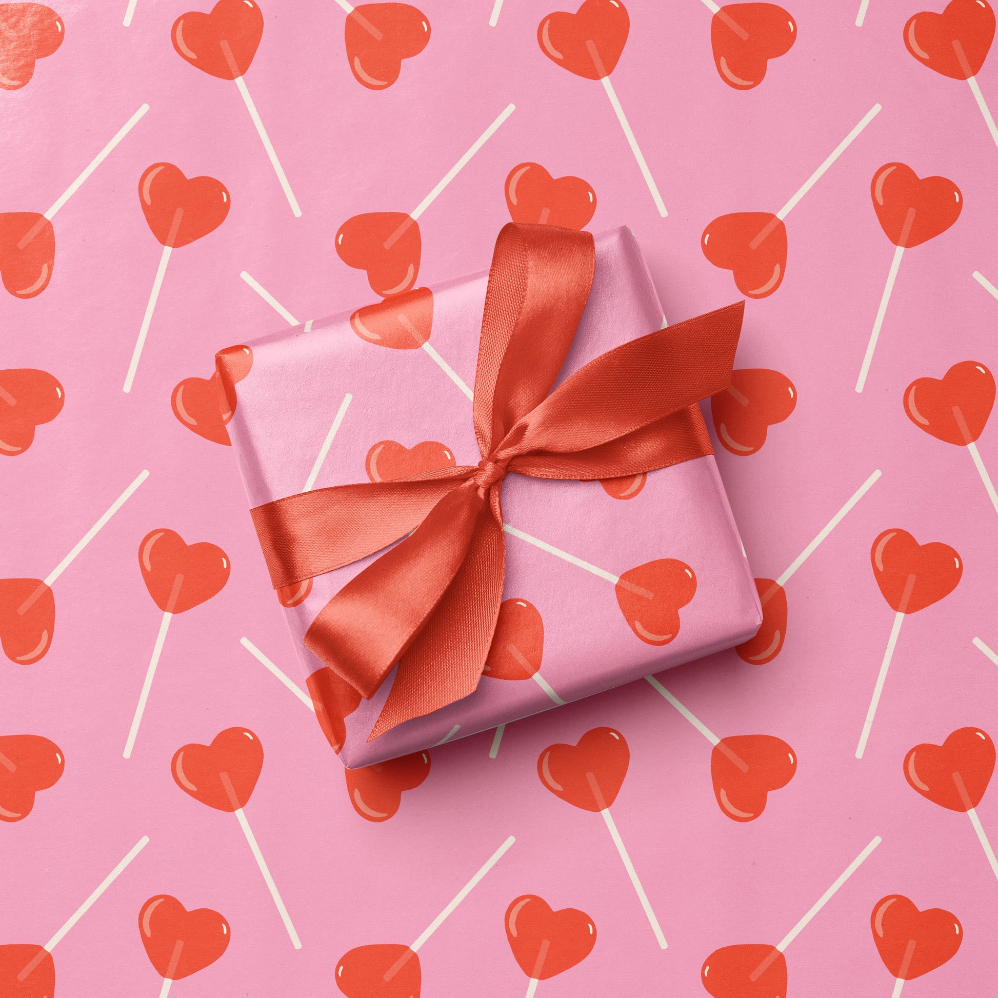 Sweet delicious heart sucker lollipops in pink & red make the perfect Lovers Day wrapping paper.
