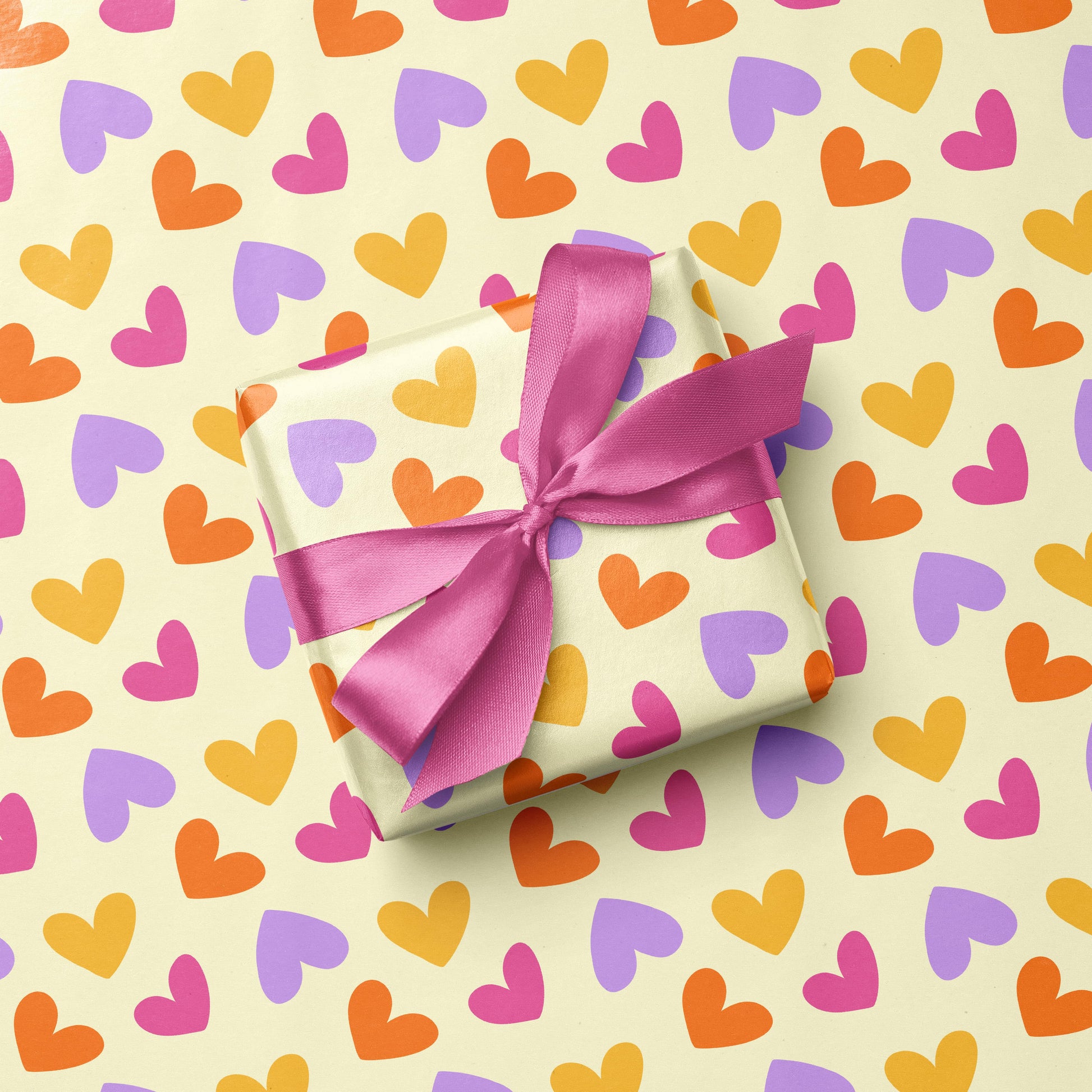 Cute papercut heart shapes spread out on a lovely pastel background. From lilac, magenta, and yellow to orange, this wrapping paper is great for all occasions from birthdays, baby showers, and anniversaries to Valentine's Day and general gifts for friends and loved ones.