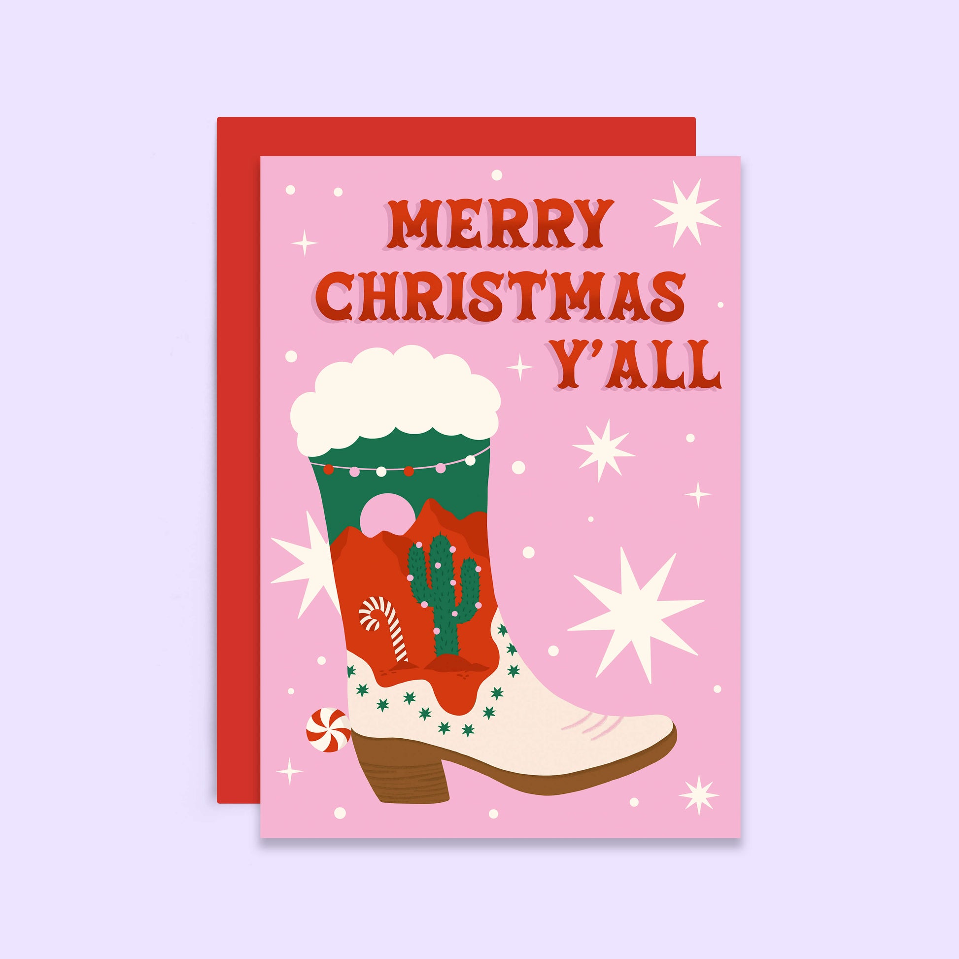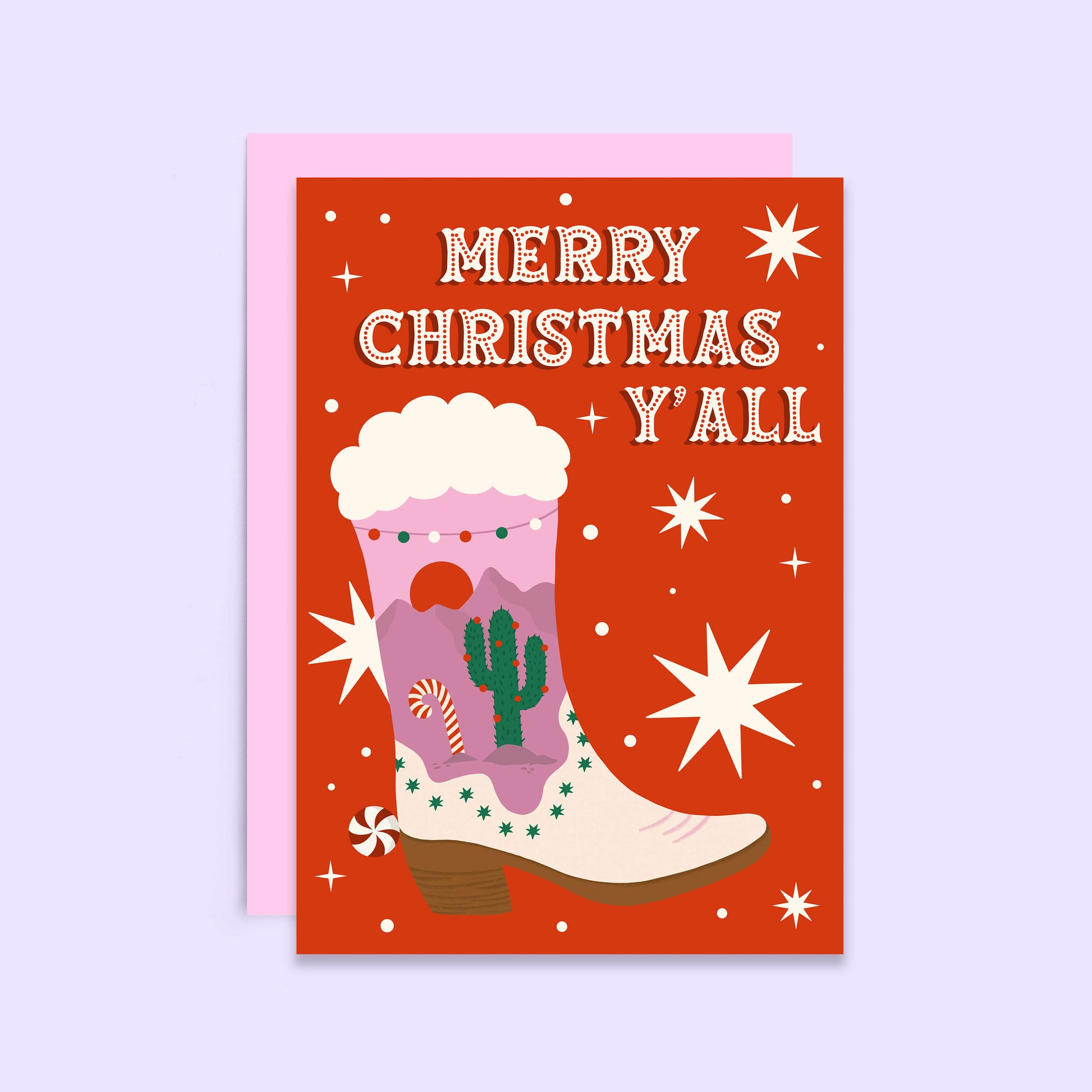 This quirky Christmas card brings a unique twist to the holidays! Featuring a pink Santa boot, a candy cane spur, and a cactus transformed into a festive Christmas tree, it's a celebration of Western charm and holiday spirit. The playful message "Merry Christmas Y'all" adds a touch of warmth and Southern hospitality. It's the perfect card for those who appreciate unique designs and a splash of cowgirl fun in their Christmas cheer.