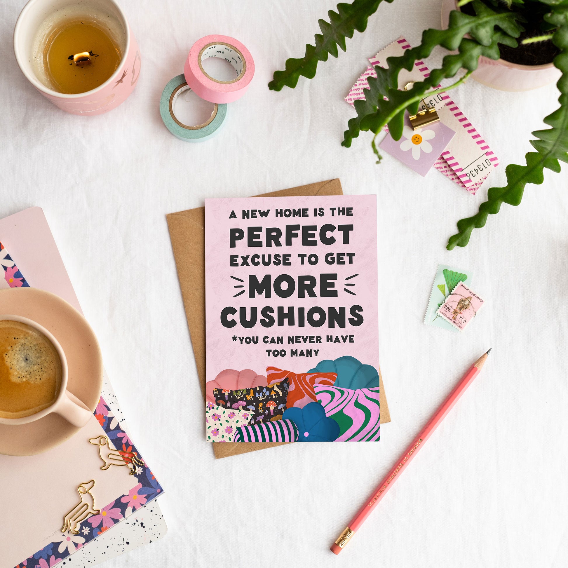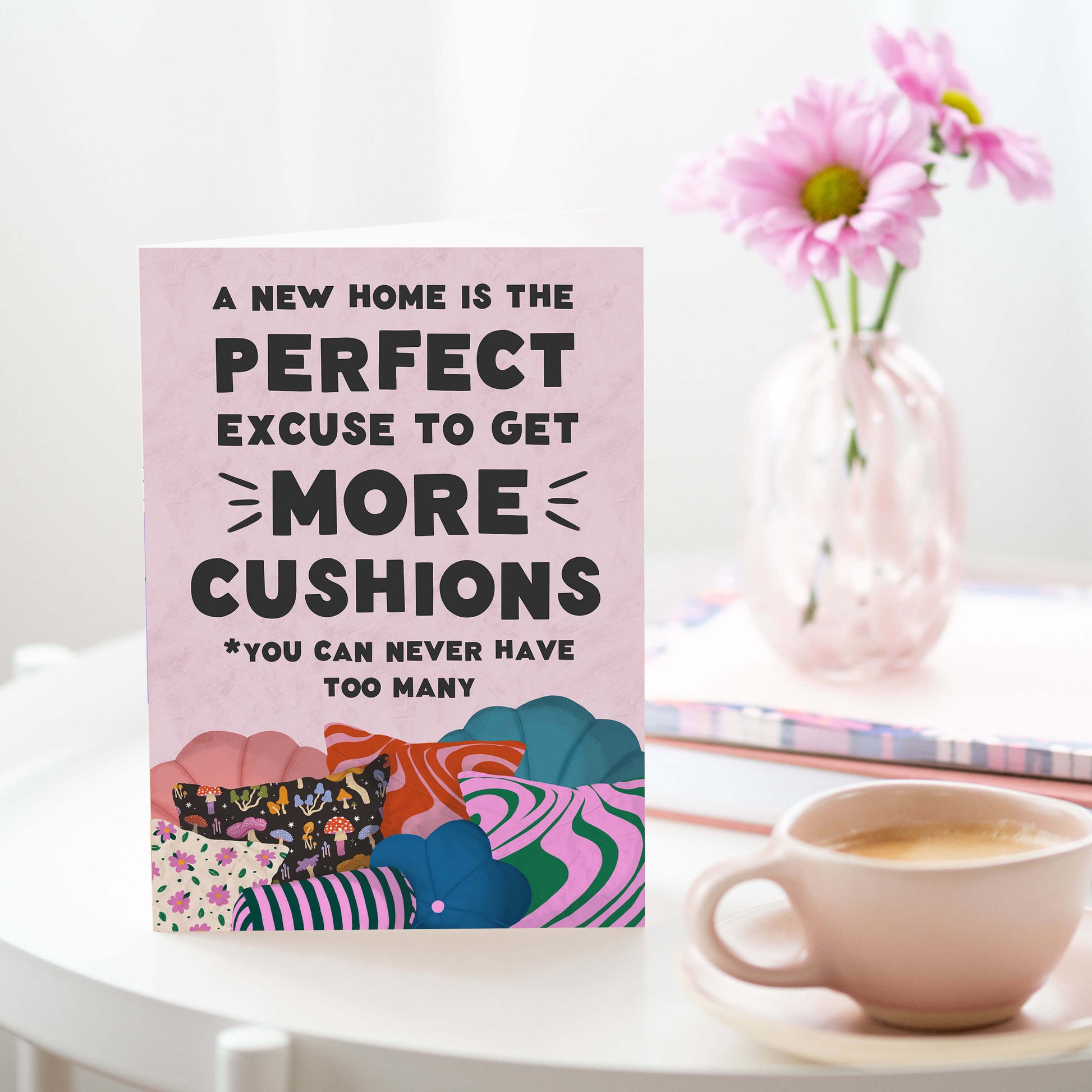 If you're looking to send your congratulations and some retail therapy inspiration to a friend who's recently moved into a new home, this humorous housewarming card is just the ticket. The card showcases a towering stack of colorful and eye-catching cushions of various designs. Above the pillows, the caption playfully encourages the recipient to indulge in some shopping with the phrase, "A new home is the perfect excuse to get more cushions. You can never have too many"