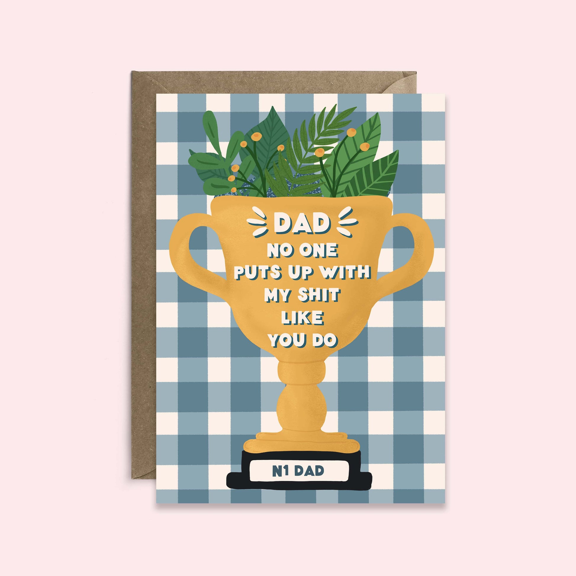 With a classic blue gingham pattern on the background and a gold cup filled with greenery, the design makes an ideal card to send as an appreciation to dad. The dad card is printed in the UK, using sustainable, environmentally friendly methods and is absolutely plastic-free. Packaged in compostable cello, the card comes blank don't he inside for your customer's handwritten message.