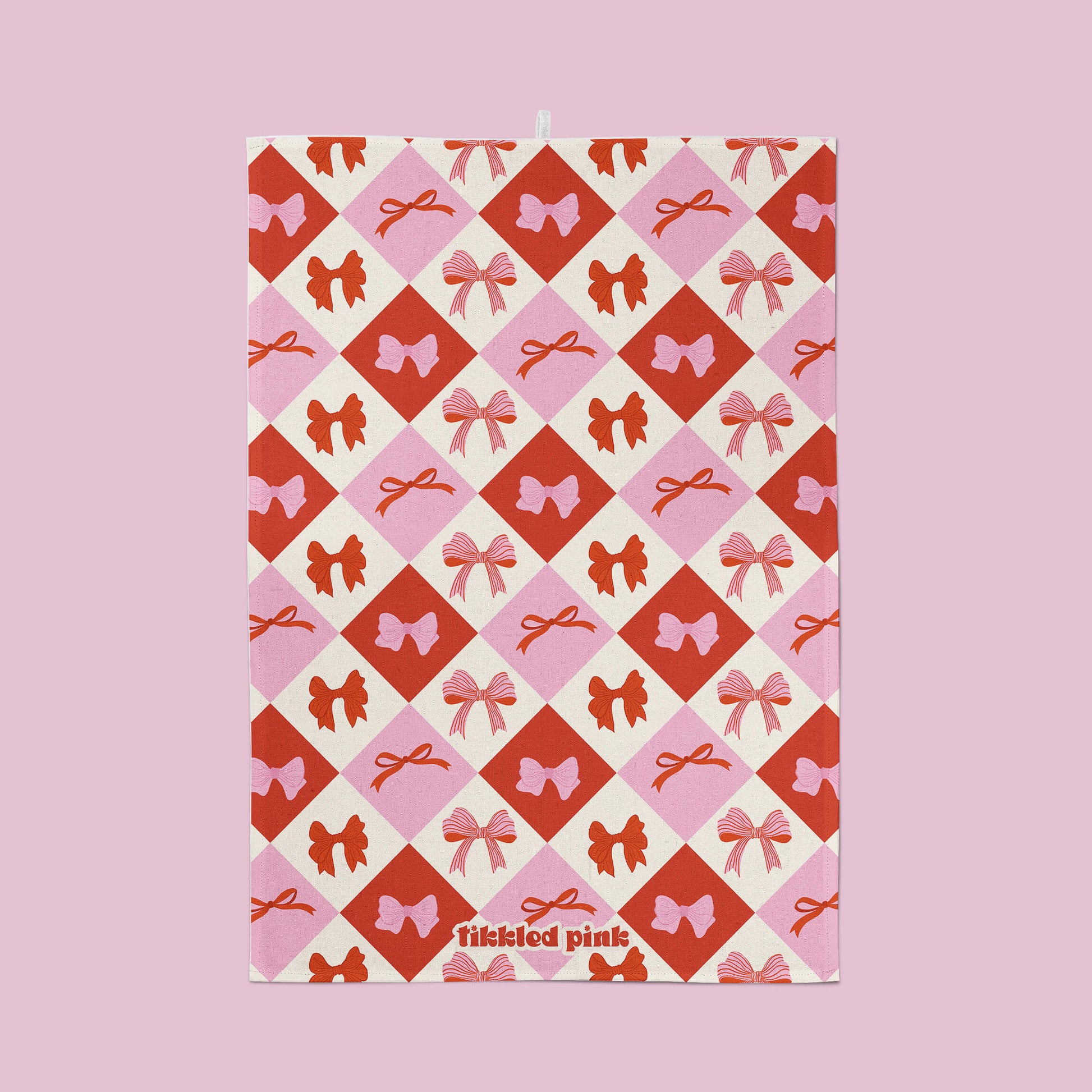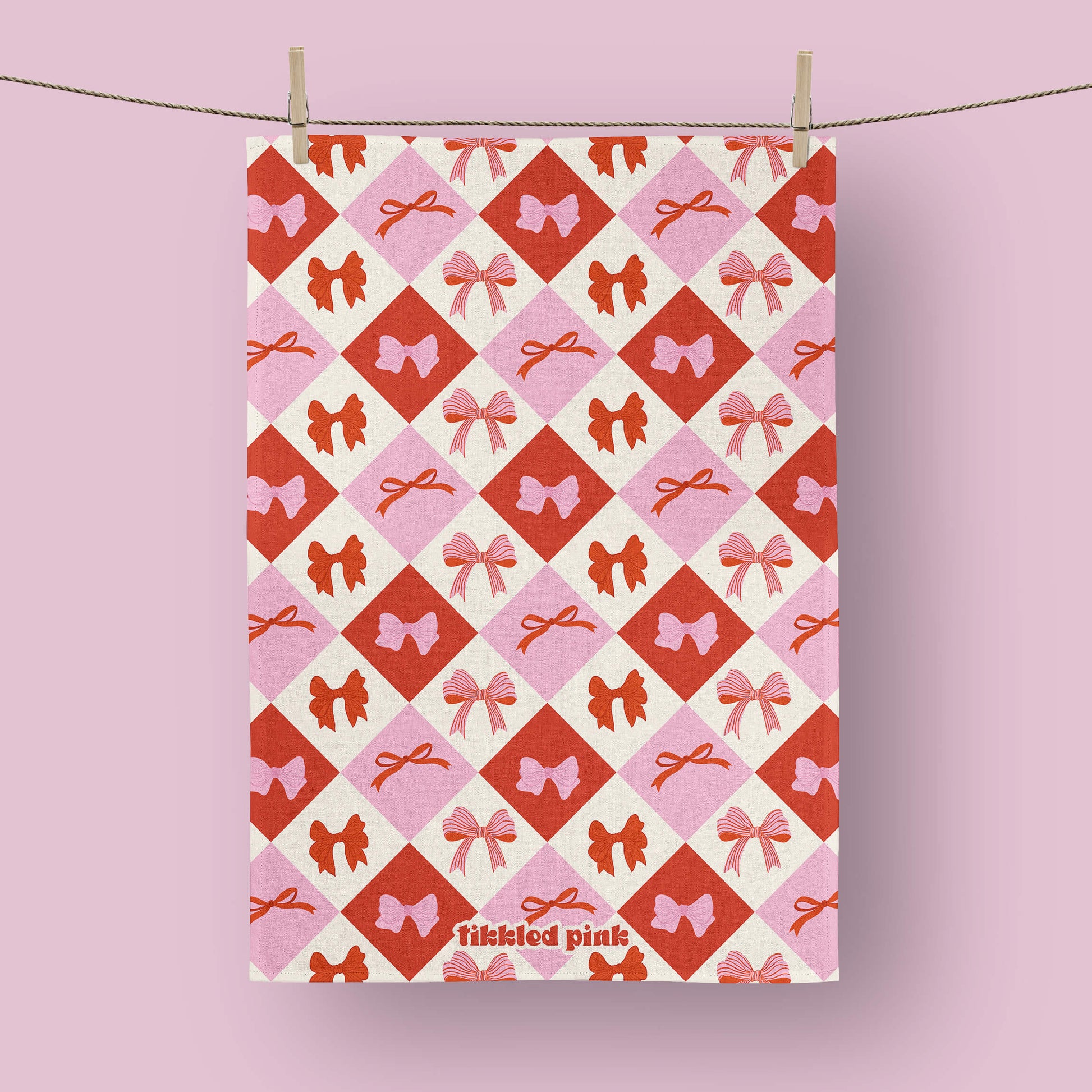 Add a dash of retro charm to your kitchen with this playful tea towel from Tikkled Pink. The bold checkerboard pattern, creates a dynamic visual that's sure to catch the eye. Scattered across this geometric wonderland are various red and pink bows, adding a touch of whimsy and femininity to the design. It's as if a 1950s diner decided to throw a tea party, and everyone's invited! This versatile, high-quality tea towel is digitally printed in the UK on 100% cotton fabric, making it both stylish and functional. Whether you're drying dishes or simply want to jazz up your oven door, this tea towel is the perfect accessory for the vintage lover or anyone who appreciates a pop of pattern in their daily life.