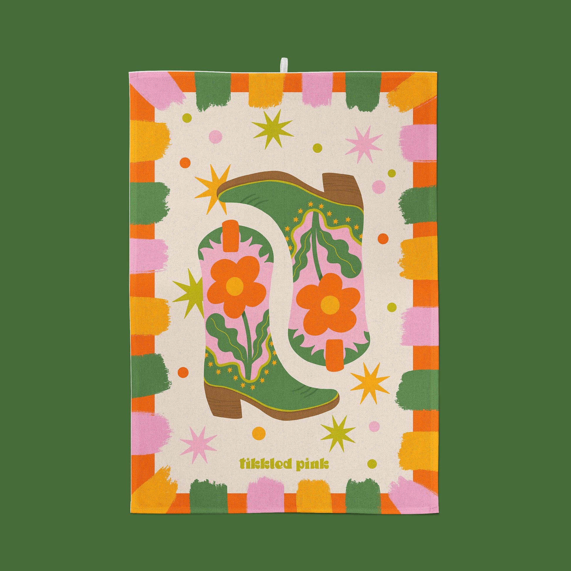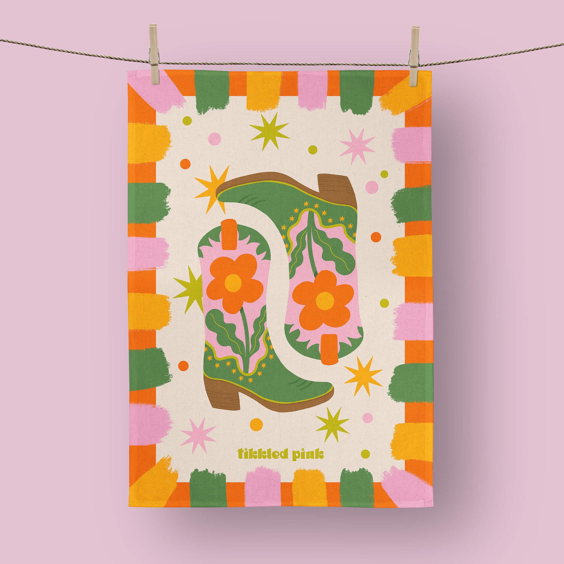 Add a touch of vintage flair to your kitchen with our Retro Cowgirl Boots Tea Towel. This eye-catching design features stylish vintage coloured cowgirl boots adorned with a large, vibrant flower motif. The bold, retro-inspired colors and intricate detailing create a visually stunning piece that is sure to be a conversation starter.