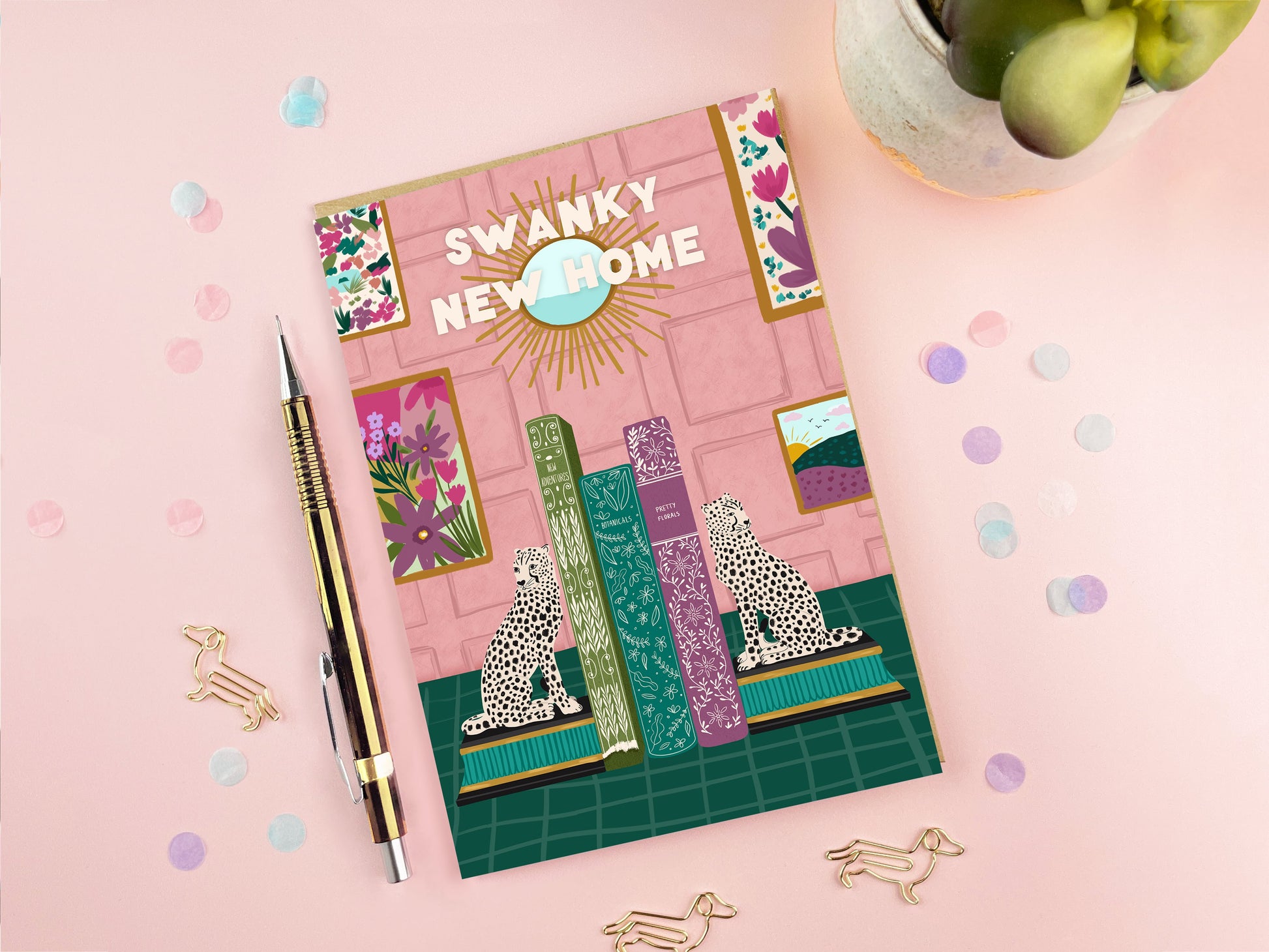 Huge congratulations are in order, someone has a swanky new home! This highly detailed housewarming card celebrates the person who goes all in for maximalist home interior design. The new house card illustration features leopard-shaped bookends, hardcover novels, a golden mirror and framed art pieces, topped with the caption “Swanky New Home”.