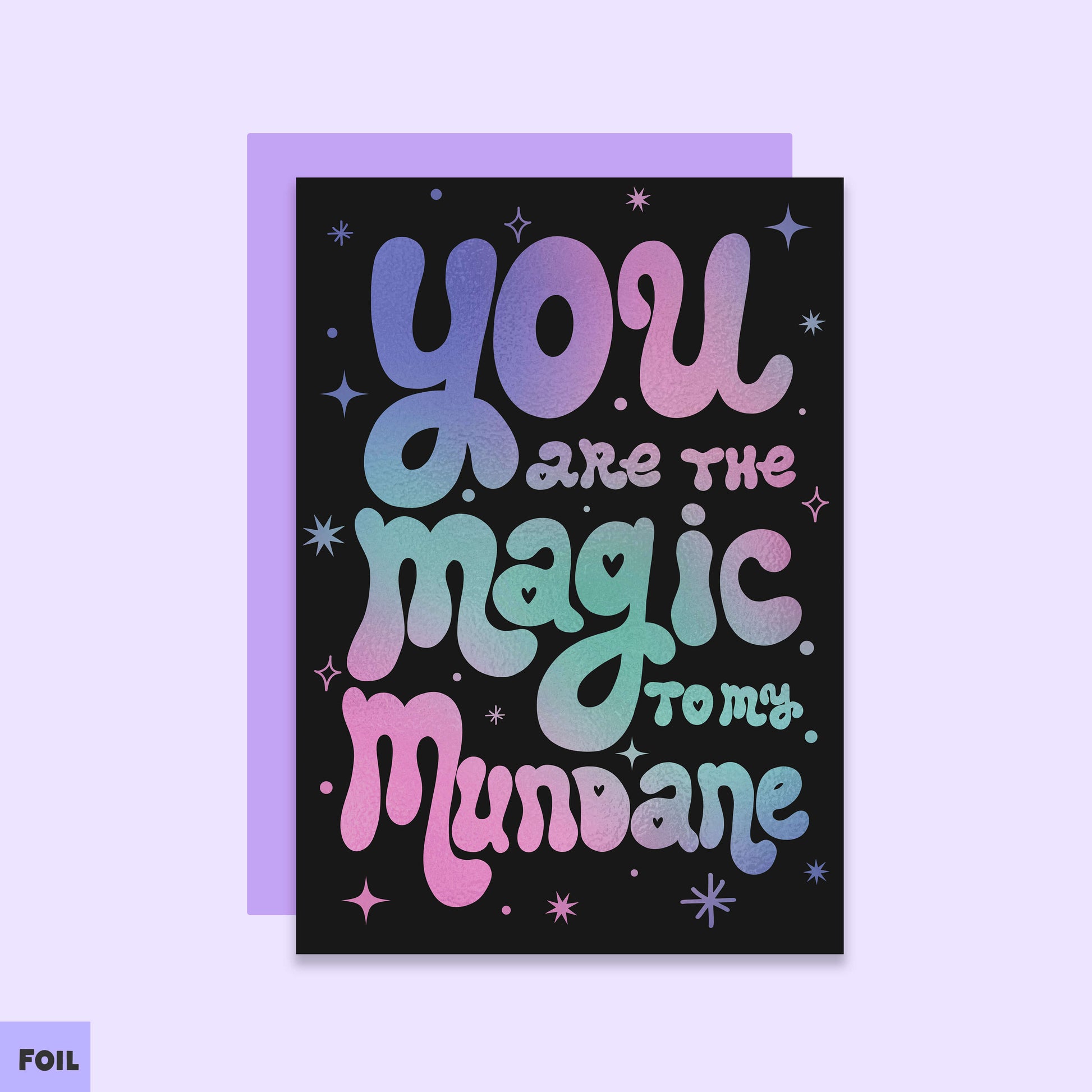 Sprinkle a little enchantment into your most meaningful relationships with this magical greeting card. The design features a powerful message of love and appreciation, "You're the Magic To My Mundane", rendered in rounded, bubbly, hand-lettered typography that dances across a deep, dark background. Printed with vibrant gradient foil, the card catches and reflects light in a mesmerising display that transforms with every movement - just like how someone special can transform an ordinary day. Perfect for expressing deep appreciation to a partner, best friend, or anyone who adds a spark of wonder to your world. This isn't just a card; it's a shimmering celebration of the extraordinary people who make life extraordinary.