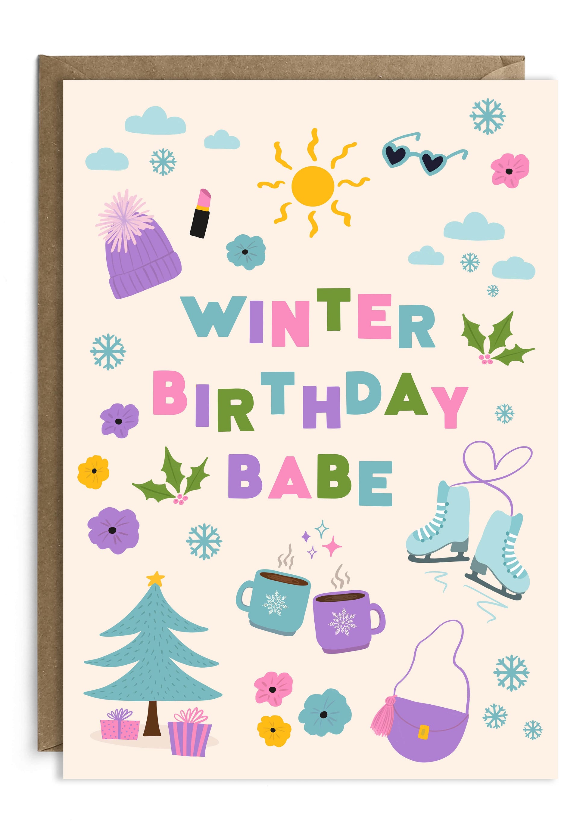 This winter birthday card is part of a collection of seasonal birthday cards from UK-based paper products brand, Tikkled Pink. The range also includes a summer birthday card, spring birthday card and autumn birthday card.